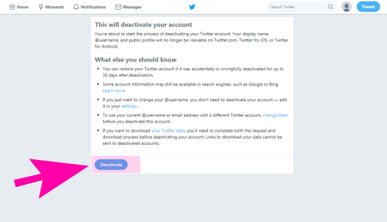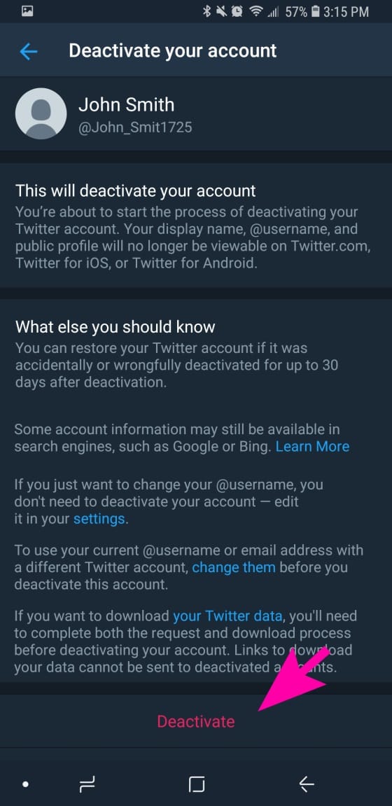 يوصي Twitter بجعل اسم المستخدم وعنوان البريد الإلكتروني الخاصين بك متاحين لإعادة الاستخدام قبل إلغاء تنشيط الحساب، إذا كنت تعتقد أنك قد ترغب في العودة إلى التطبيق في وقت ما في المستقبل وللقيام بذلك، ما عليك سوى تغيير اسم المستخدم وعنوان البريد الإلكتروني في منطقة إعدادات الملف الشخصي وتأكد من تأكيد التغيير بالنقر فوق الارتباط الموجود في رسالة التأكيد الإلكترونية التي سيرسلها Twitter قبل متابعة التعطيل.