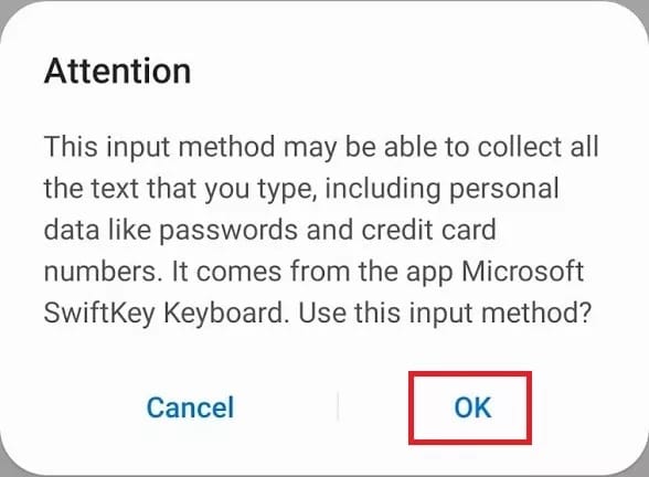 - من المحتمل أن تتلقى تحذيراً من أن لوحة المفاتيح المخصصة يمكنها جمع البيانات بما في ذلك كلمات المرور وأرقام الائتمان.