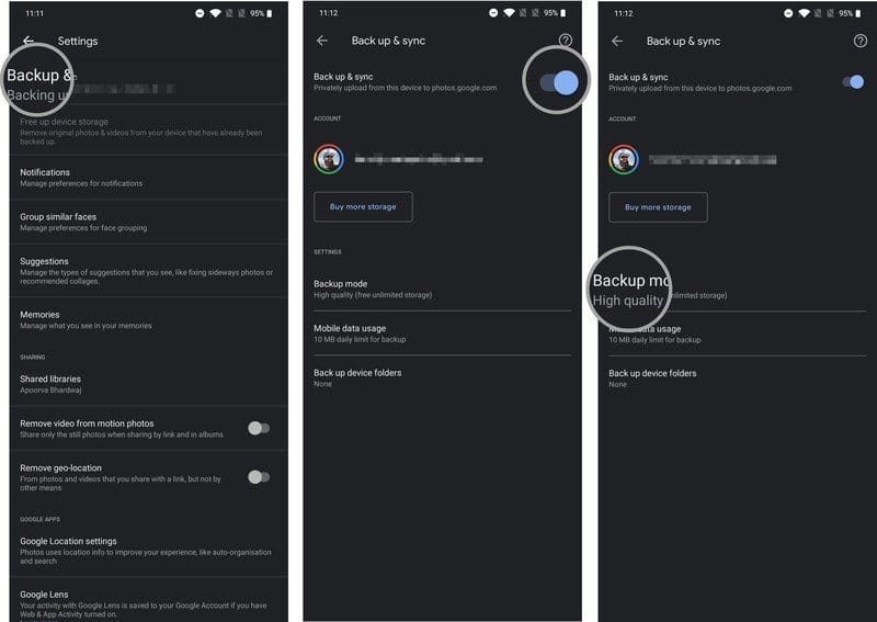- التأكد من تعيين مفتاح التبديل الخاص بالنسخ الاحتياطي والمزامنة على تشغيل.