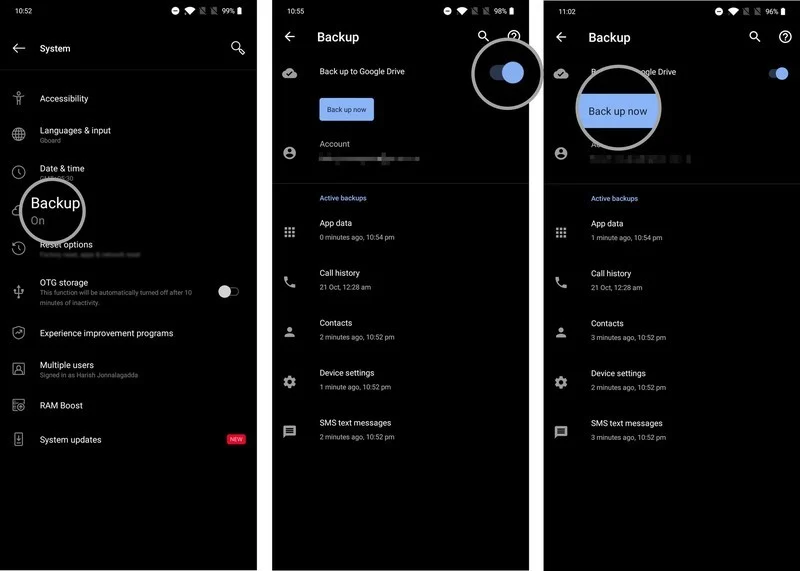 - الضغط على النسخ الاحتياطي الآن لمزامنة أحدث البيانات على الهاتف مع Google Drive.